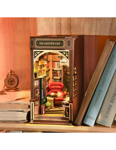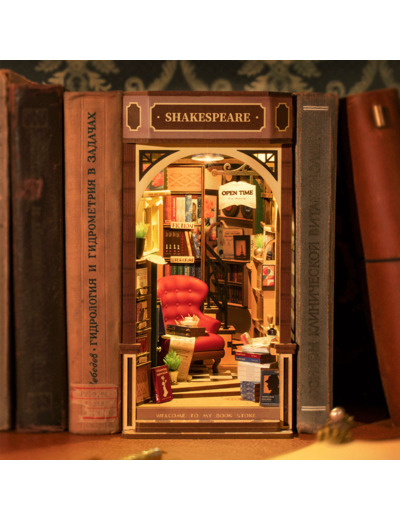 Serre-livre en bois, et papier cartonné (pour les décors), à assembler soi-même.