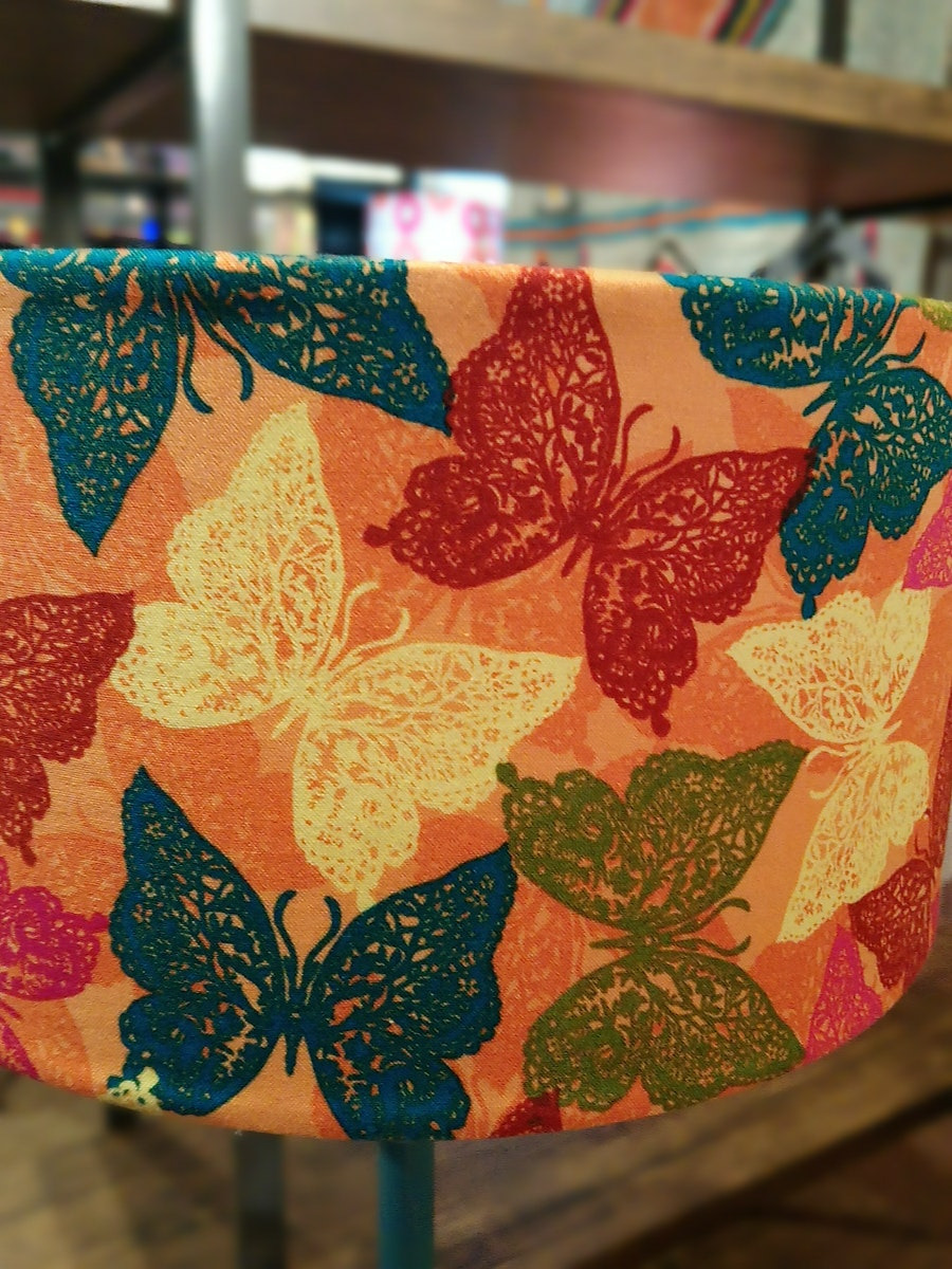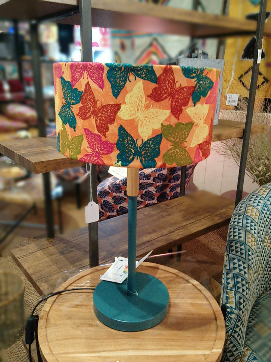 Jolie lampe sur pied en bois et métal vert canard avec abat-jour papillons colorés sur fond orangé, l'accessoire déco indispensable à votre salon !