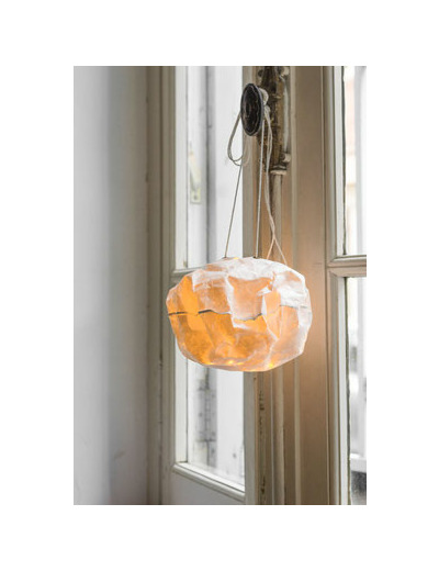 Jolie boule lumineuse design à suspendre, réalisée en papier kraft, avec cordon et guirlande led (à piles) intégrée.