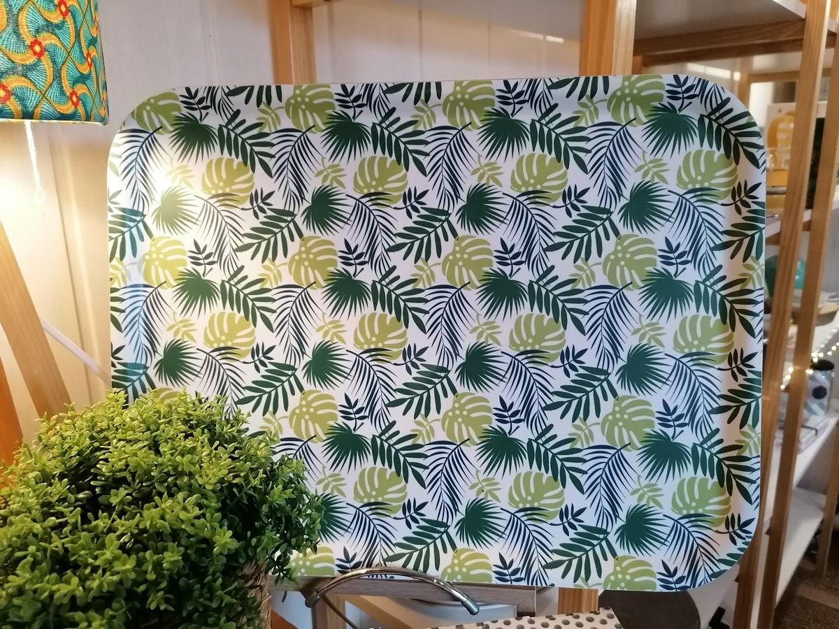 Joli plateau au graphisme feuillage, idéal pour servir vos plats à table, votre goûter ou l'apéritif entre amis.