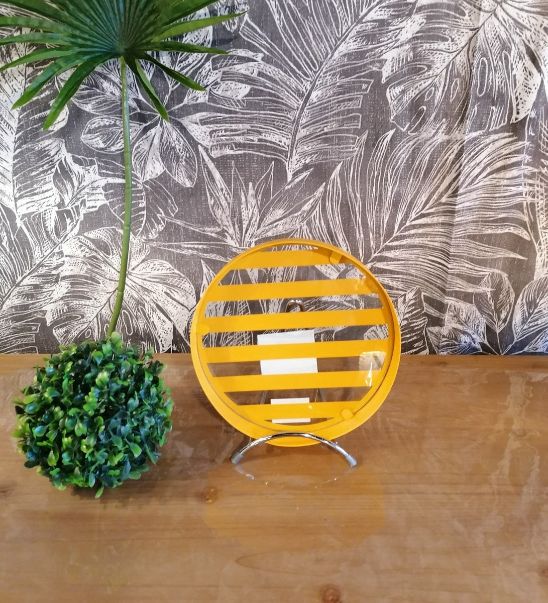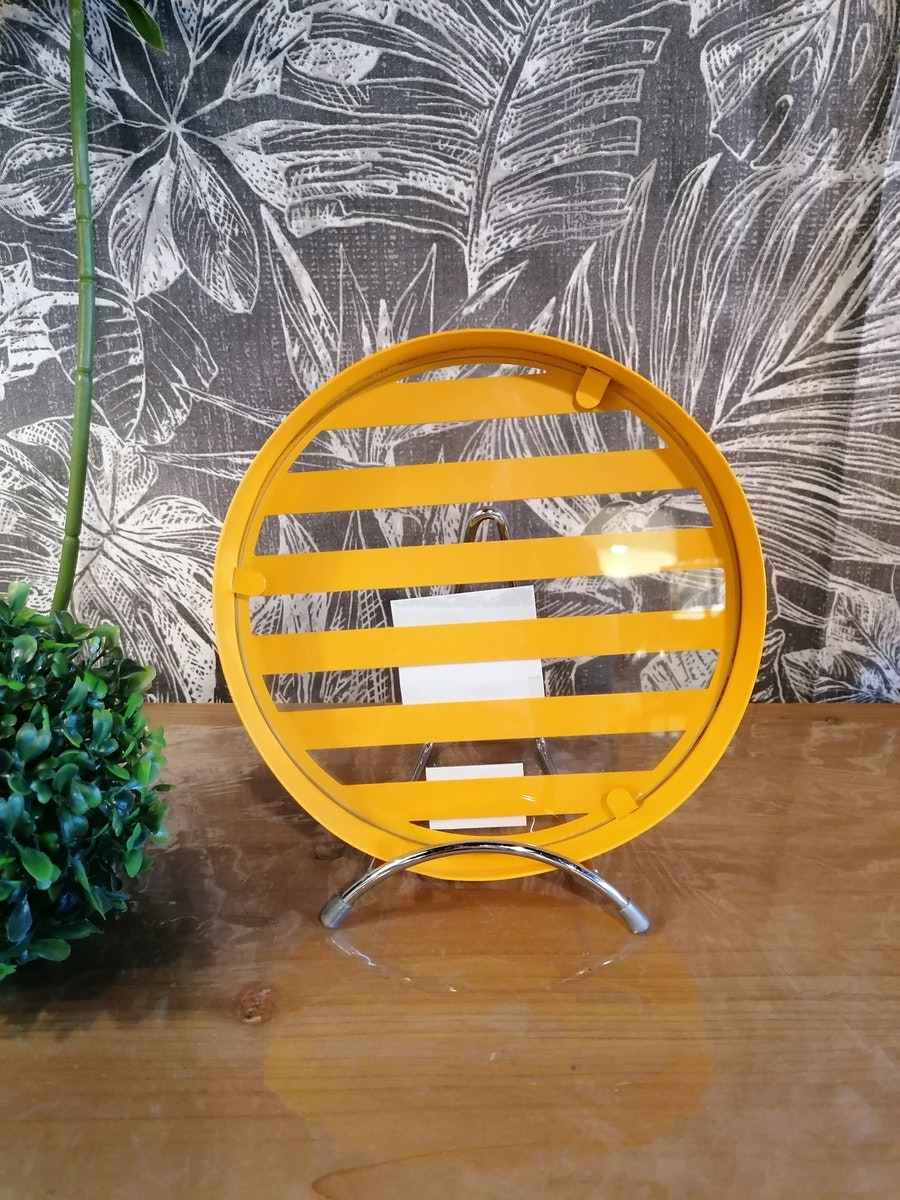 Très joli petit plateau rond à rayures jaunes à poser dans votre cuisine, idéal pour servir vos petits plats, apéritifs, pauses goûter, ...